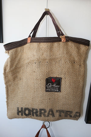 Earthen Tote bag made from upcycled burlap coffee bean sacks and lined with a 100% cotton fabric. It features double webbed handles ensuring you a long lasting shopper.